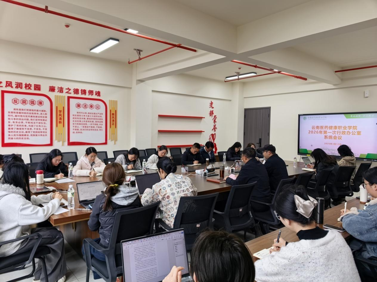 2026年3月12日,云南医药健康职业学院召开2026年第一次行政办公室系统工作会议。会议以线上线下形式同步召开,带头落实精文减会要求。会议由校长办公室副主任陈顺主持,分管行政工作的副校长昝雪峰出席会议并讲话。各二级院部、职能部门行政工作负责人参会。
