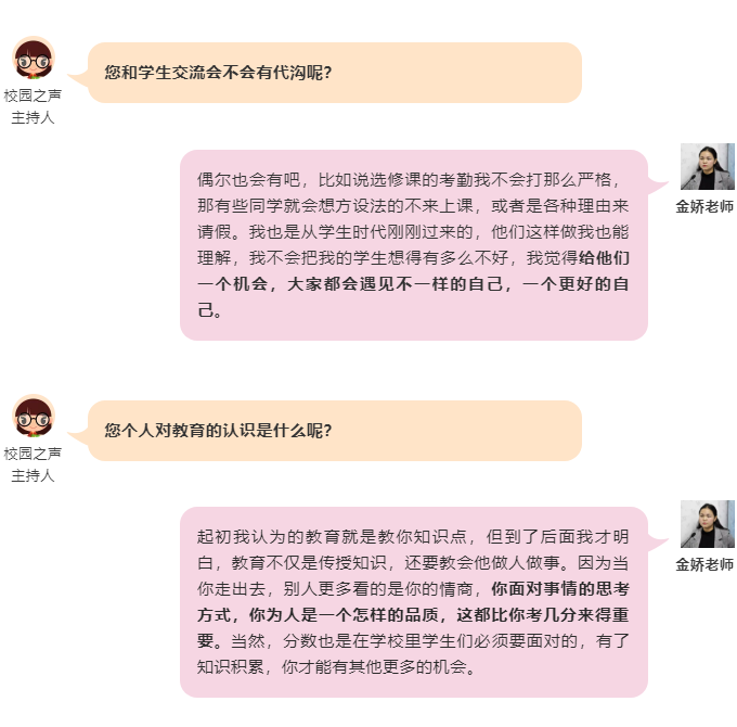 从金娇老师的身上大家不仅看到了活力与热血,也看到了稳重与责任。相信在今后的教学生涯中,金娇老师会带着她的信念与坚定给大家展现更多惊喜。