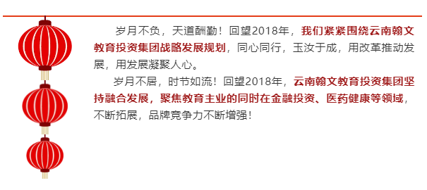 日月既往,不可复追。2018年是翰文教育集团浓墨重彩、硕果累累的一年。2019年,我们将继续聚焦教育主业,不断拓展金融投资、医药健康等产业,以乘势而上的冲劲,持之以恒地推进内涵发展,坚定不移地推进各项改革,一如既往地打造教育集团品牌文化,继续坚持“以奋斗者为本”,凝心聚力建设翰文教育集团,书写云南民办高等教育奋进之笔,向伟大祖国建国70周年献礼致敬!