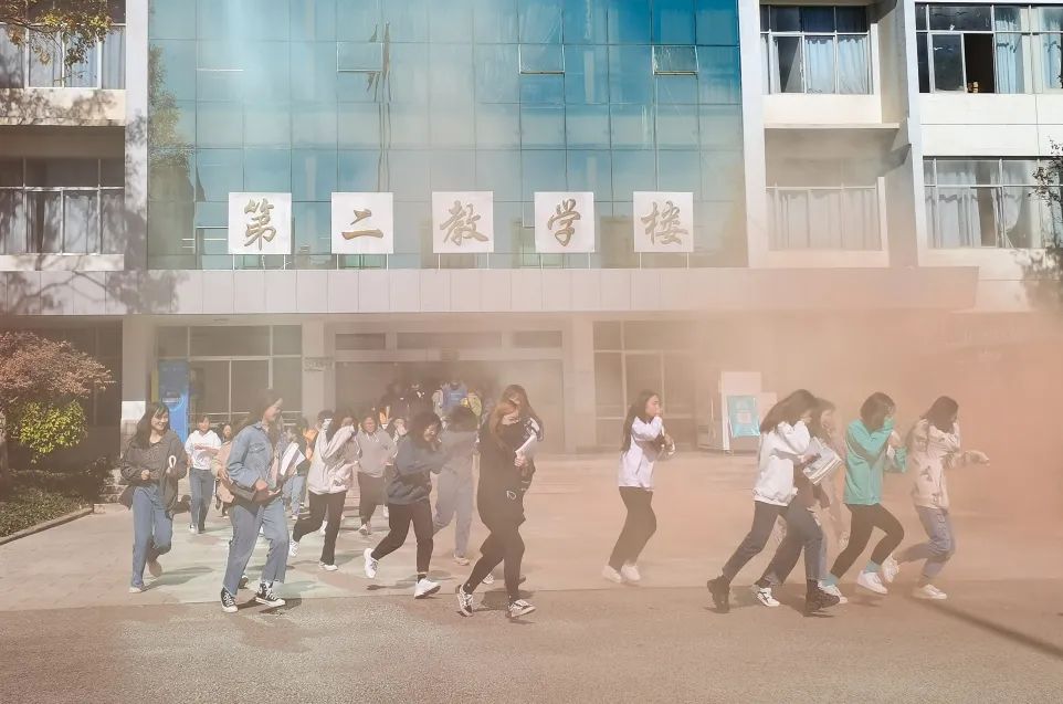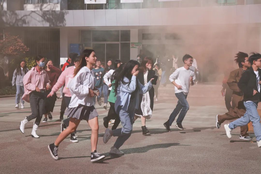 参加消防演练的师生及工作人员在运动场集合,体验了火灾模拟逃生,在真实环境下模拟了火灾现场。